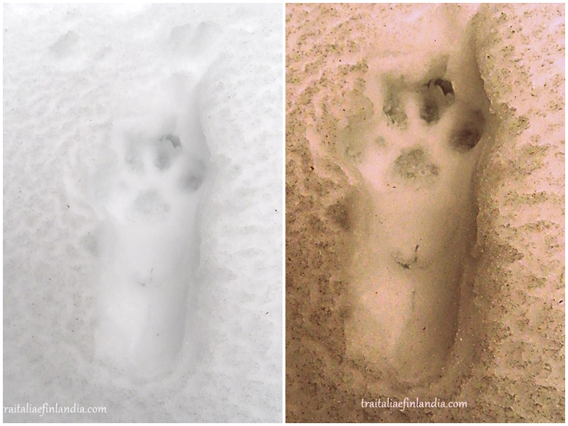 Per finire, le impronte che la sopracitata gattona ha lasciato nella neve fresca: una e’ ampiamente rielaborata per farla risaltare e una e’ paragonata alla dimensione della mia scarpa.