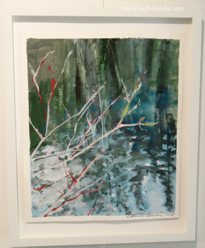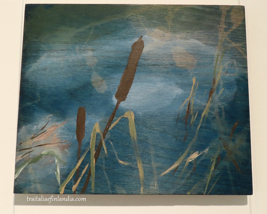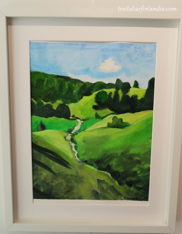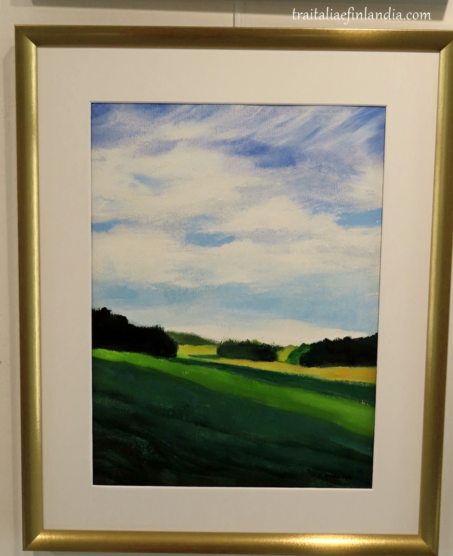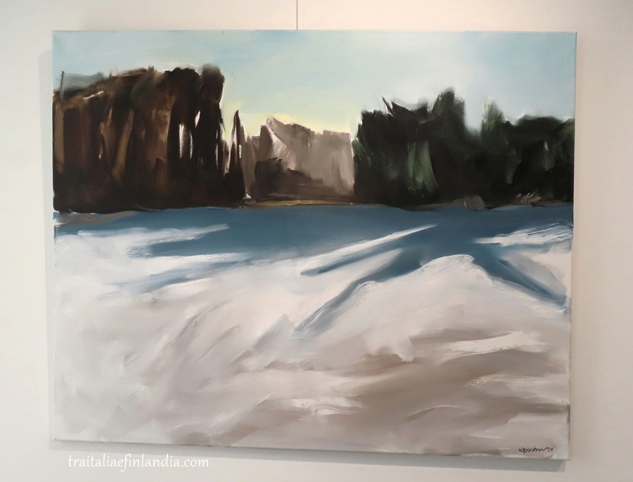 Io ho visitato questa mostra qualche giorno fa e vi propongo alcuni quadri. Iniziamo dal primo qui sopra, che e’ fra i miei preferiti: “Rekijoki Häntälän notkot”, di Ritva Kokkola-Lemarchand, che ritrae una zona semi-collinare solcata da un piccolo fiume che assomiglia ad un canyon in miniatura. Una zona che conosco bene.