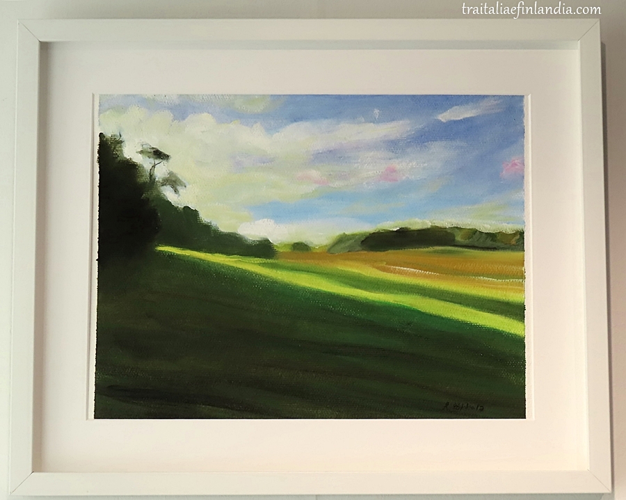 “Poutapäivä peltomaisema” di Ritva Kokkola-Lemarchand rappresenta un panorama campestre in un giorno senza pioggia.