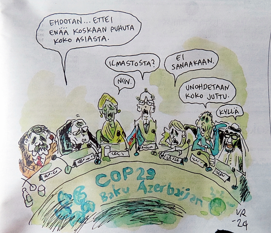 The first photo I am sharing is a cartoon from Helsingin Sanomat that effectively describes the tragic conclusion of COP 29, the climate conference held in Baku last November that did not lead to any important decisions and was even deserted by some countries. The cartoon says in short: “I suggest not to talk about it anymore. Yes, here, let’s forget the whole thing”.