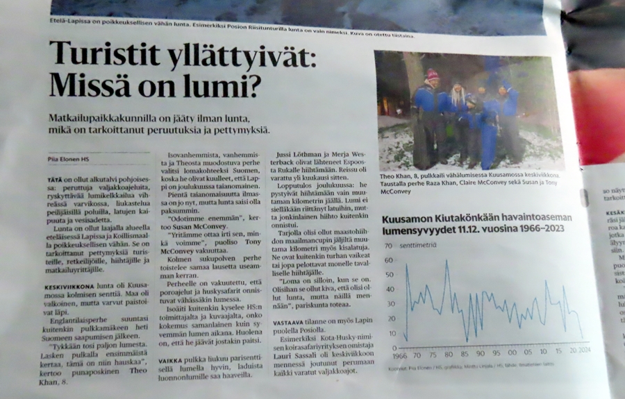 Gli articoli sopracitati sono di novembre/dicembre 2024 e confermano la tendenza di questo inverno cosi’ povero di precipitazioni. Natale 2024 e’ stato completamente senza neve nella Finlandia meridionale e la caratteristica piu’ eclatante e’ stato il continuo afflusso di aria calda da sud, che ha fatto sciogliere anche il deposito accumulato durante le nevicate.
