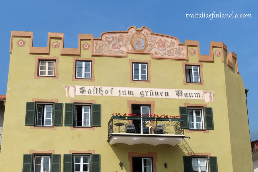 Si chiama:  “Zum Gruener Baum”,  cioe’:  “All’Albero Verde”,  si affaccia sulla piazzetta centrale ed e’ un edificio storico.