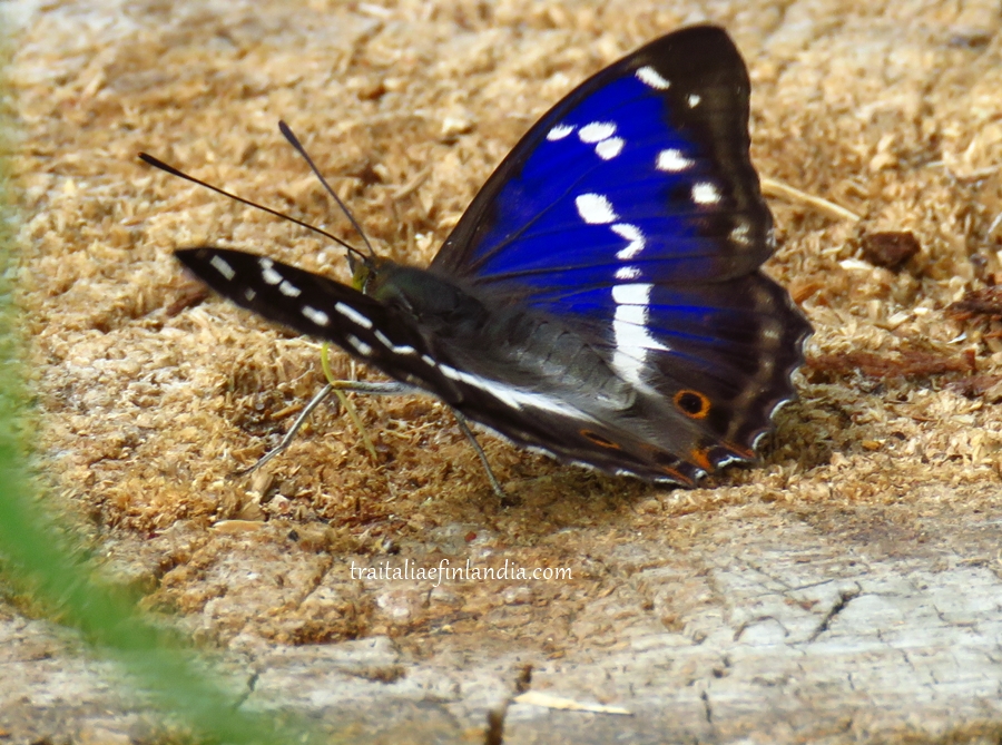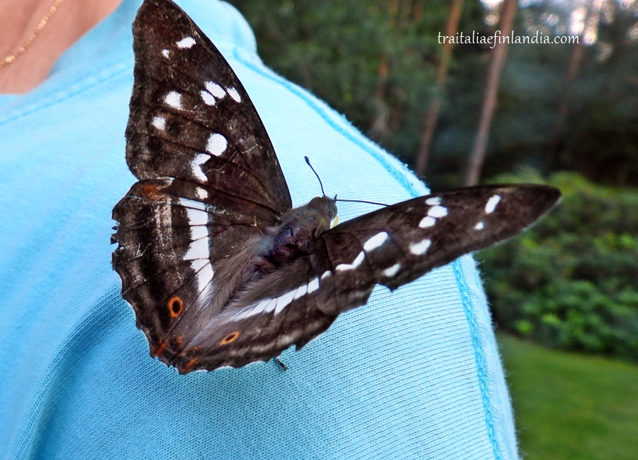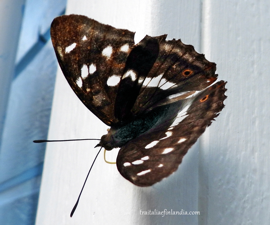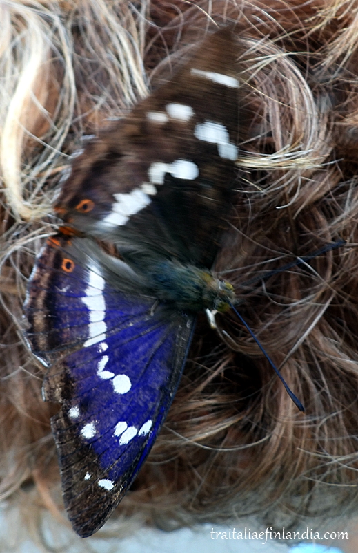 Questa bellissima Farfalla Iride (Apatura Iris),  che anche in finlandese si chiama:  Häiveperhonen,  essendo stata da me disturbata e fotografata piu’ volte,  si e’ spostata dal muro di casa alla mia persona e ai miei capelli.