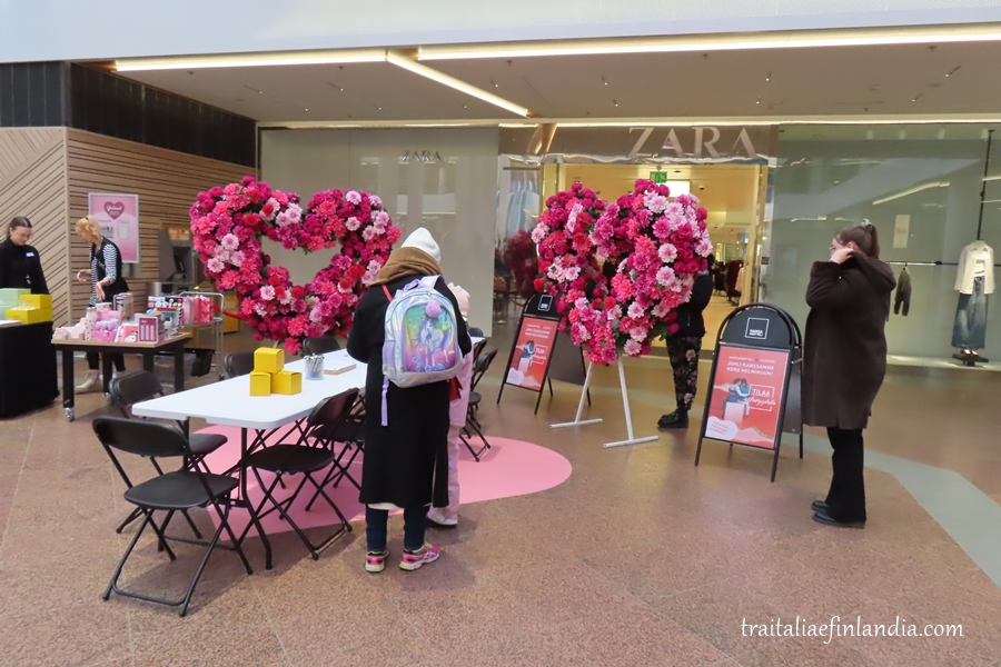 Io intanto vi propongo un giro a Turku per vedere come viene festeggiata qui la giornata. Nelle foto sopra: nel piccolo centro commerciale Hansakortteli, campeggiano due cuori floreali in attesa di un selfie memorabile.