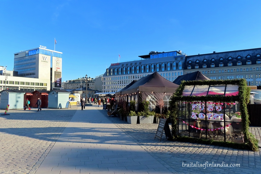 Altra proposta invitante: il Caffe’ Eino, proprio in mezzo alla piazza centrale Kauppatori, ha allestito un padiglione a parte adatto alle coppiette. Temperatura interna garantita 20 gradi C, malgrado i -5 fuori. Nome del padiglione: Pusu Koppi, cioe’: “cabina del bacio”.