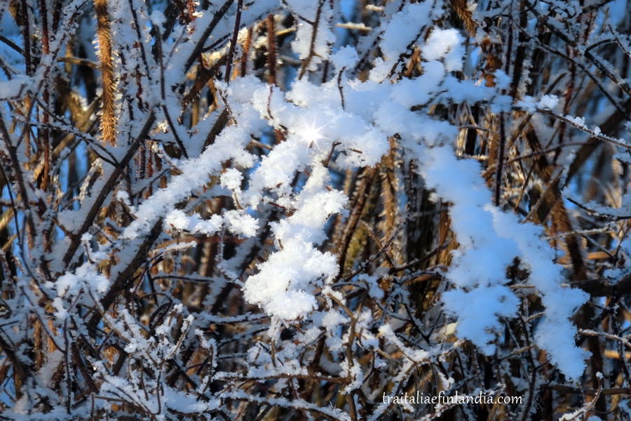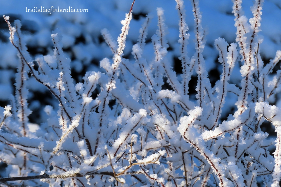 Dalla finestra della nostra cucina vediamo i rami delle rose di San Giovanni ricoperte di gelo. Ma quando il tempo e’ cosi’ freddo significa che c’e’ alta pressione e quindi sole. In effetti abbiamo giornate solendide e tutto il panorama scintilla dei brillantini della neve…