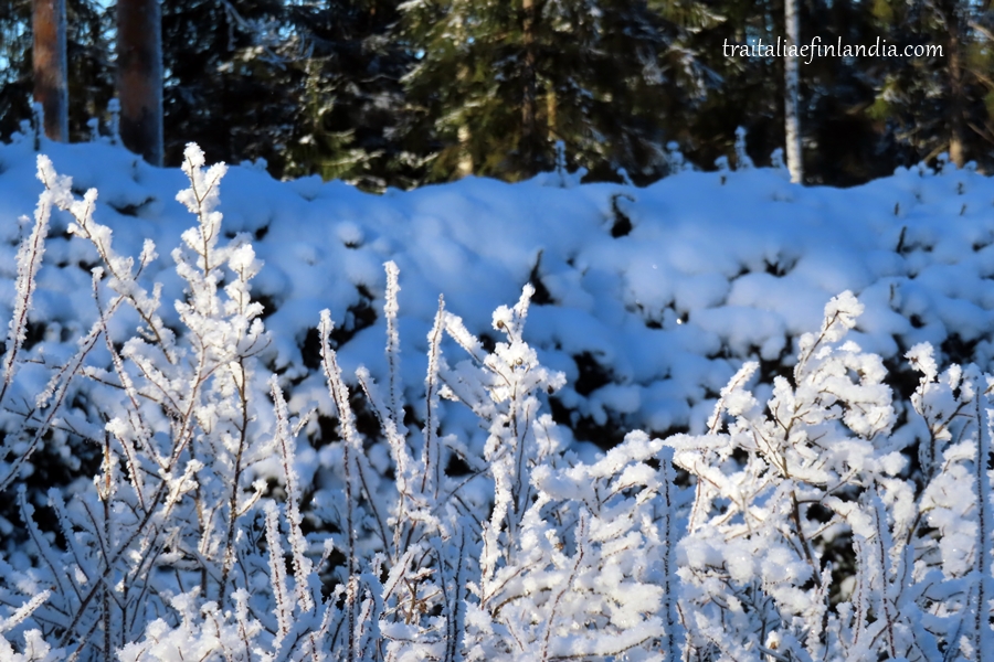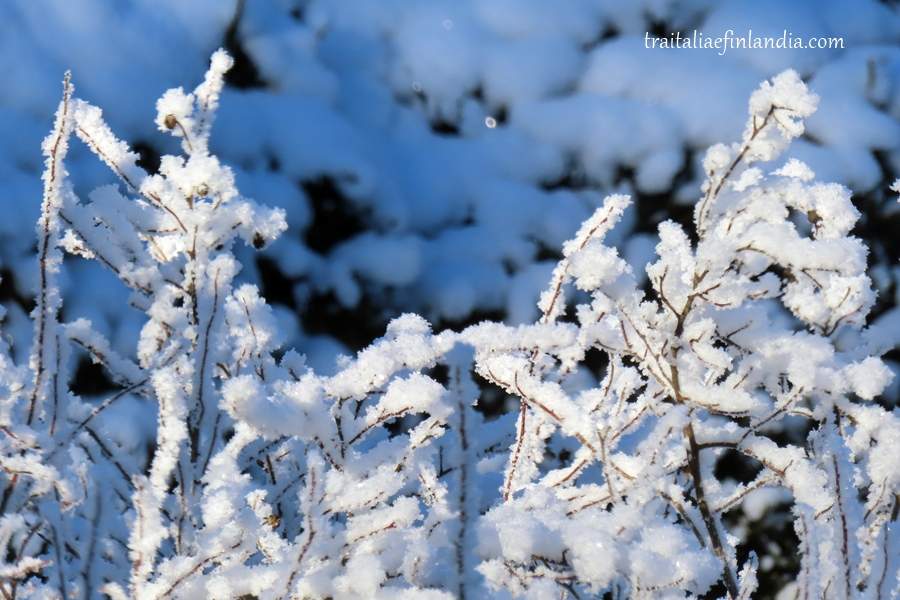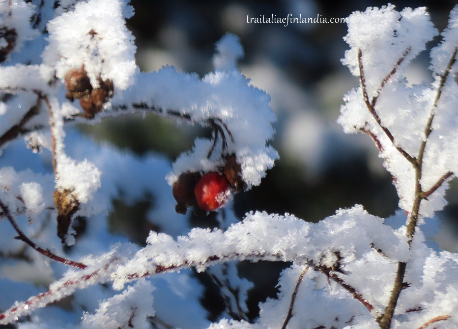 Dalla finestra della nostra cucina vediamo i rami delle rose di San Giovanni ricoperte di gelo. Ma quando il tempo e’ cosi’ freddo significa che c’e’ alta pressione e quindi sole. In effetti abbiamo giornate solendide e tutto il panorama scintilla dei brillantini della neve…