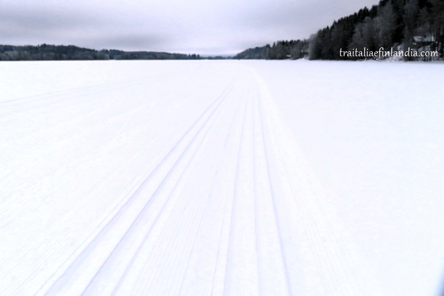 Fortunatamente i laghi hanno avuto il buon gusto di gelare, cosi’ i volontari del locale sci-club hanno tracciato la pista nella poca neve caduta sopra la loro superficie. In particolare nelle mie foto vedete il grande lago di Hirsjärvi, che quest’inverno si e’ trasformato in un parco divertimenti.