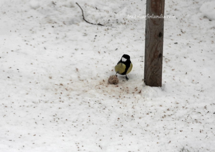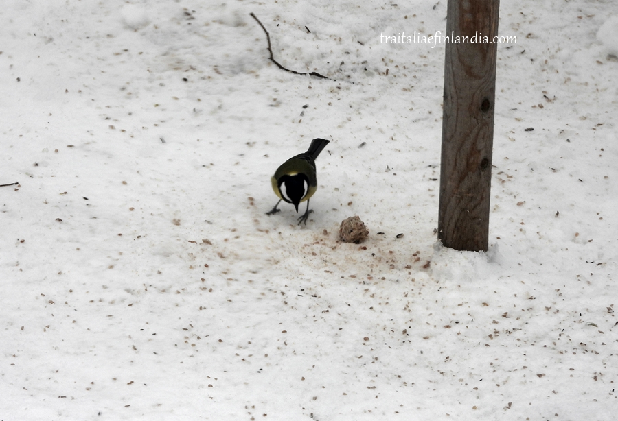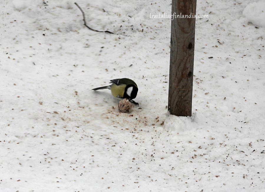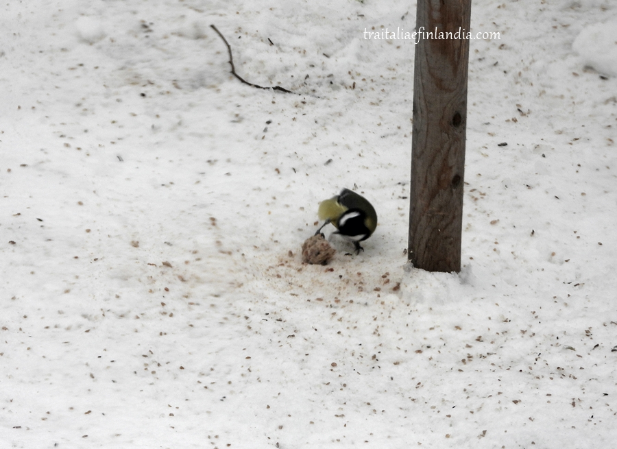 Una piccola pallina di grasso per uccellini e’ caduta per terra dalle mangiatoie e la piccola Cinciallegra se ne appropria immediatamente.