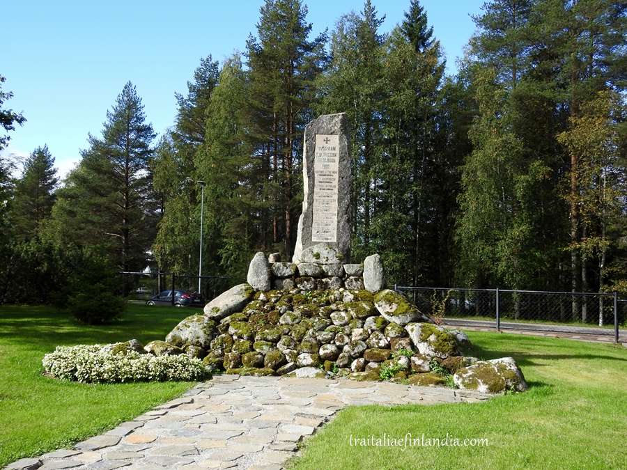 Fuori la chiesa si trova il cimitero, come sempre nelle cittadine finlandesi, con l’immancabile monumento ai caduti. Questo riguarda i caduti della Grande Guerra.