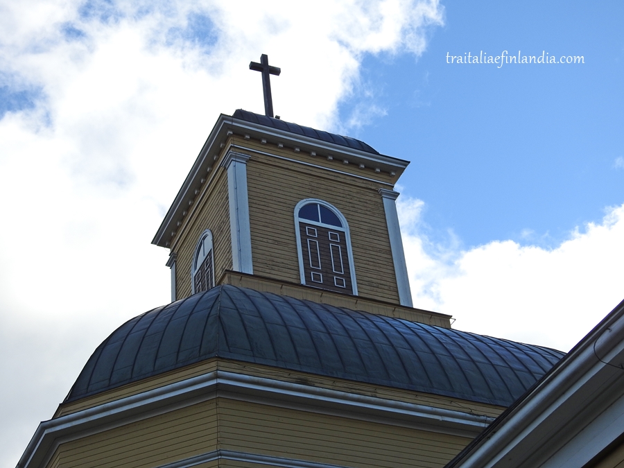 La nostra passeggiata inizia dando uno sguardo alla chiesa lignea, in pieno centro. Edificata nel primo ‘800, la chiesa dovette essere restaurata completamente dopo la Guerra d’inverno, l’invasione russa del 1939, poiche’ i bombardamenti la resero inservibile. Purtroppo l’abbiamo trovata chiusa, ma il suo stile Neoclassico lo ritroviamo in molte chiese finlandesi.