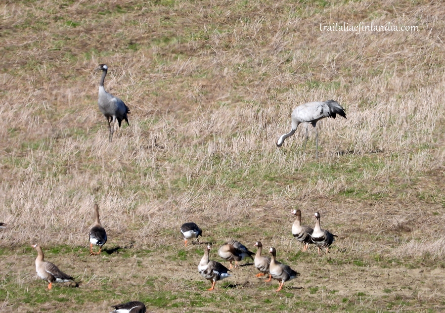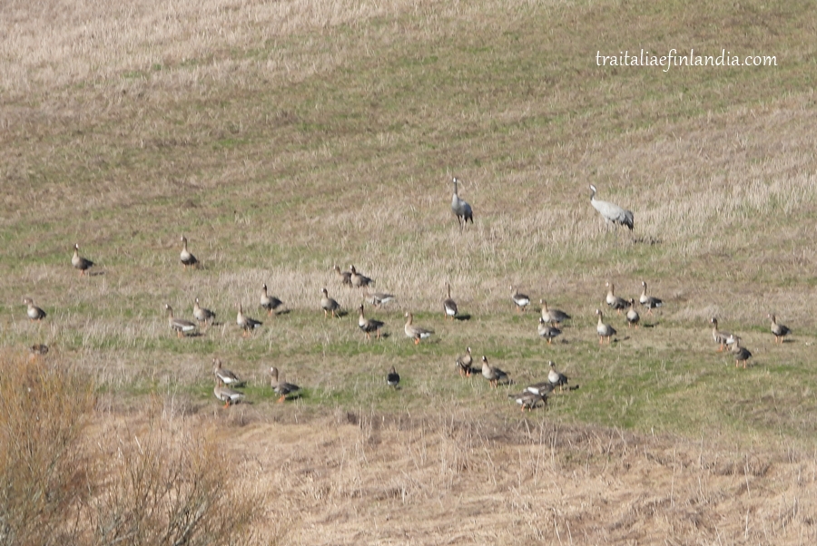 Nelle mie foto di oggi: gru e oche della tundra appena arrivate si rifocillano nei campi e nei corsi d’acqua.