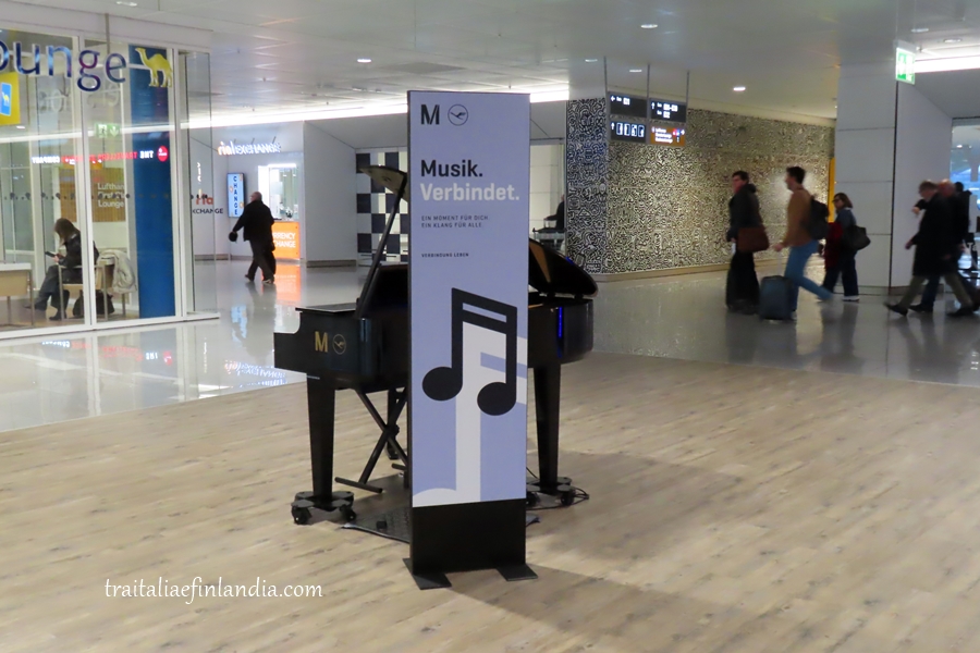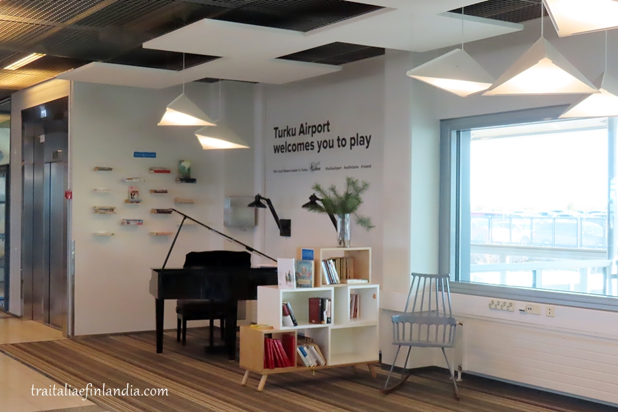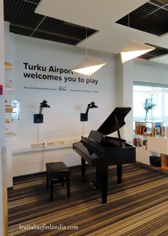Nel piccolo aeroporto di Turku ho trovato lo stesso angolo: un pianoforte che attende solo di essere suonato.